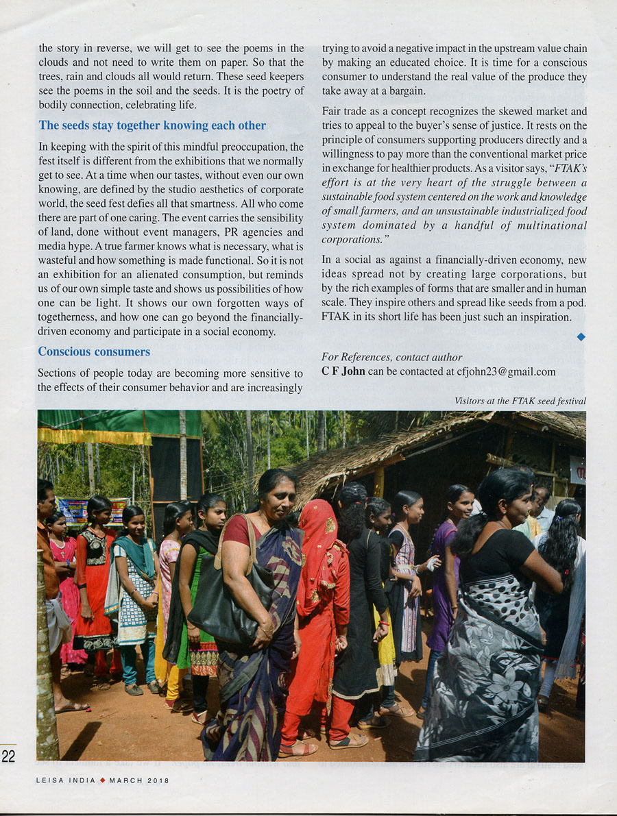 (The article wish to share on the beauty of the sustaining efforts of FTAK. About twenty-five thousand people from four districts of Kerala, (Kozhikod, Kannur, Wayanadu and Kazarkod) for the last 15 years have been procuring, preserving and exchanging all sorts of seeds, planting material, indigenous livestock, medicinal plants, indigenous and wild trees, and other living things in a focused and sustained manner)