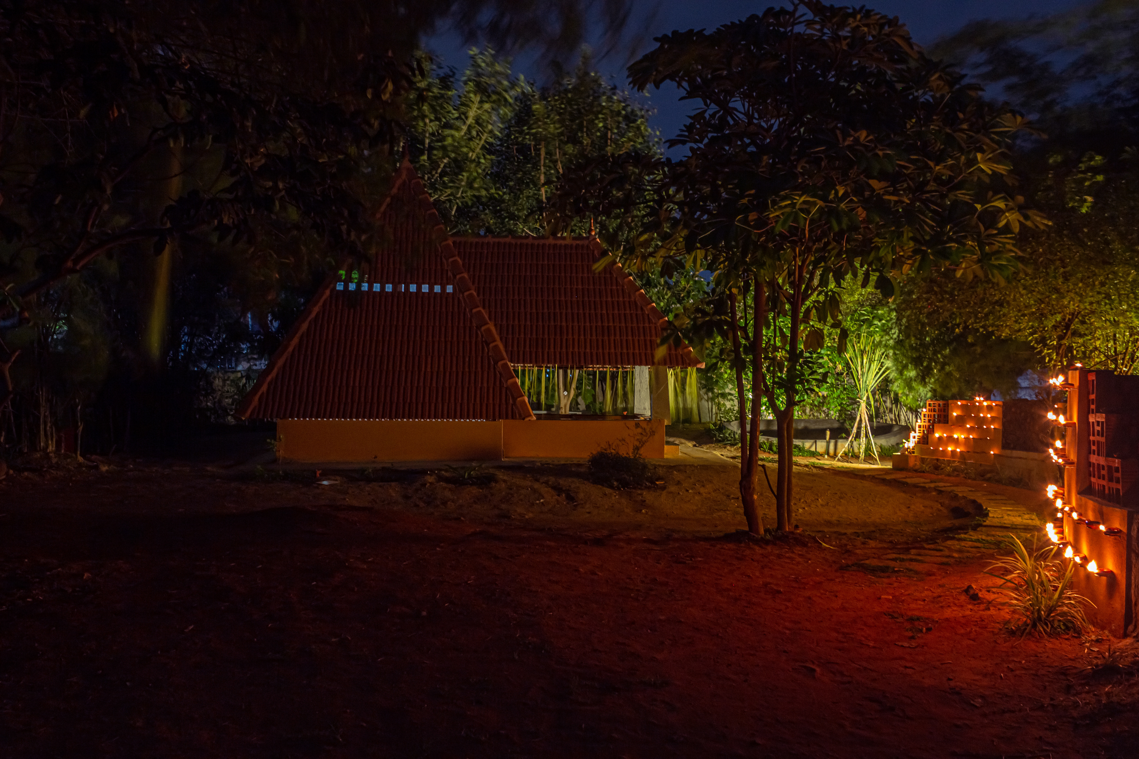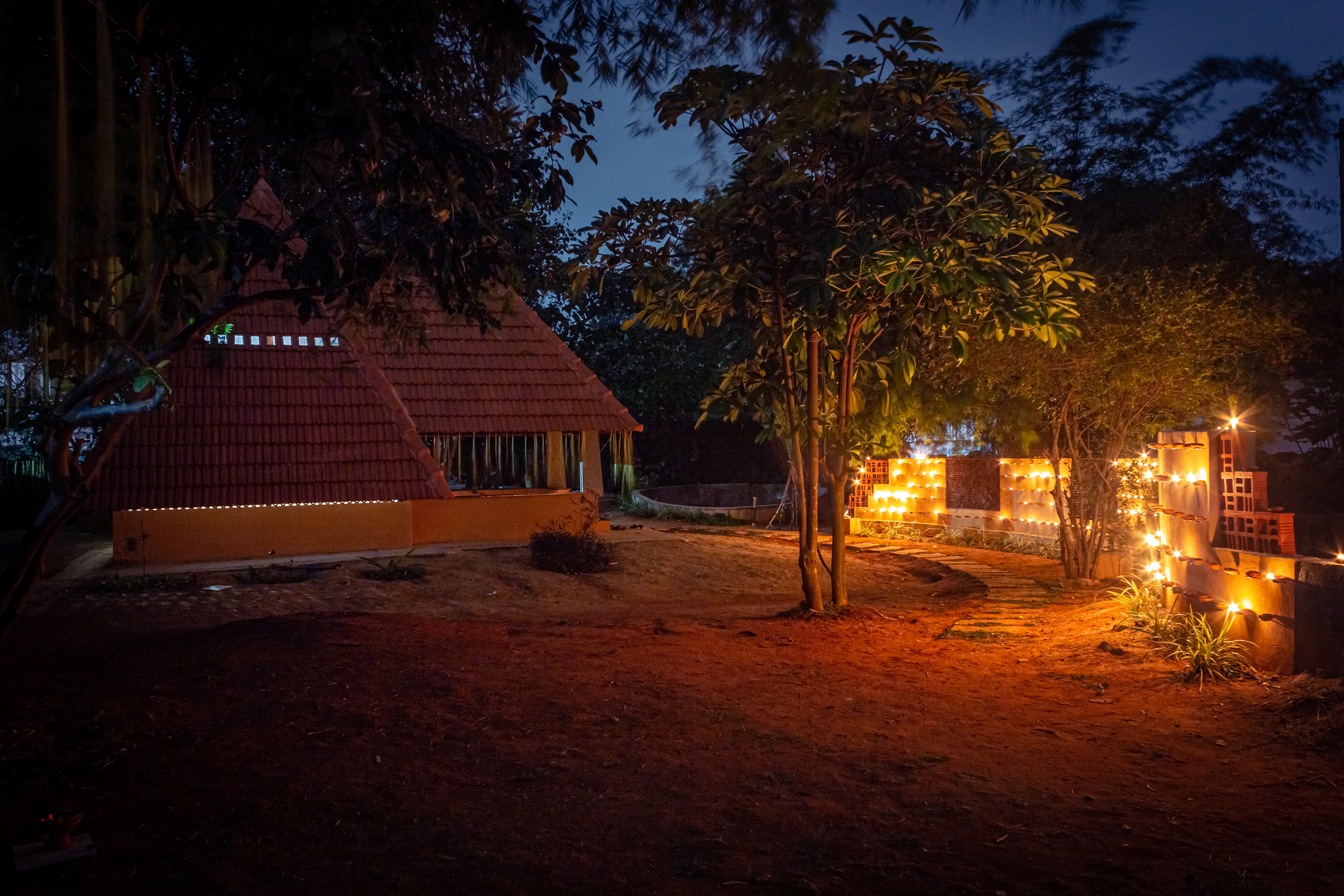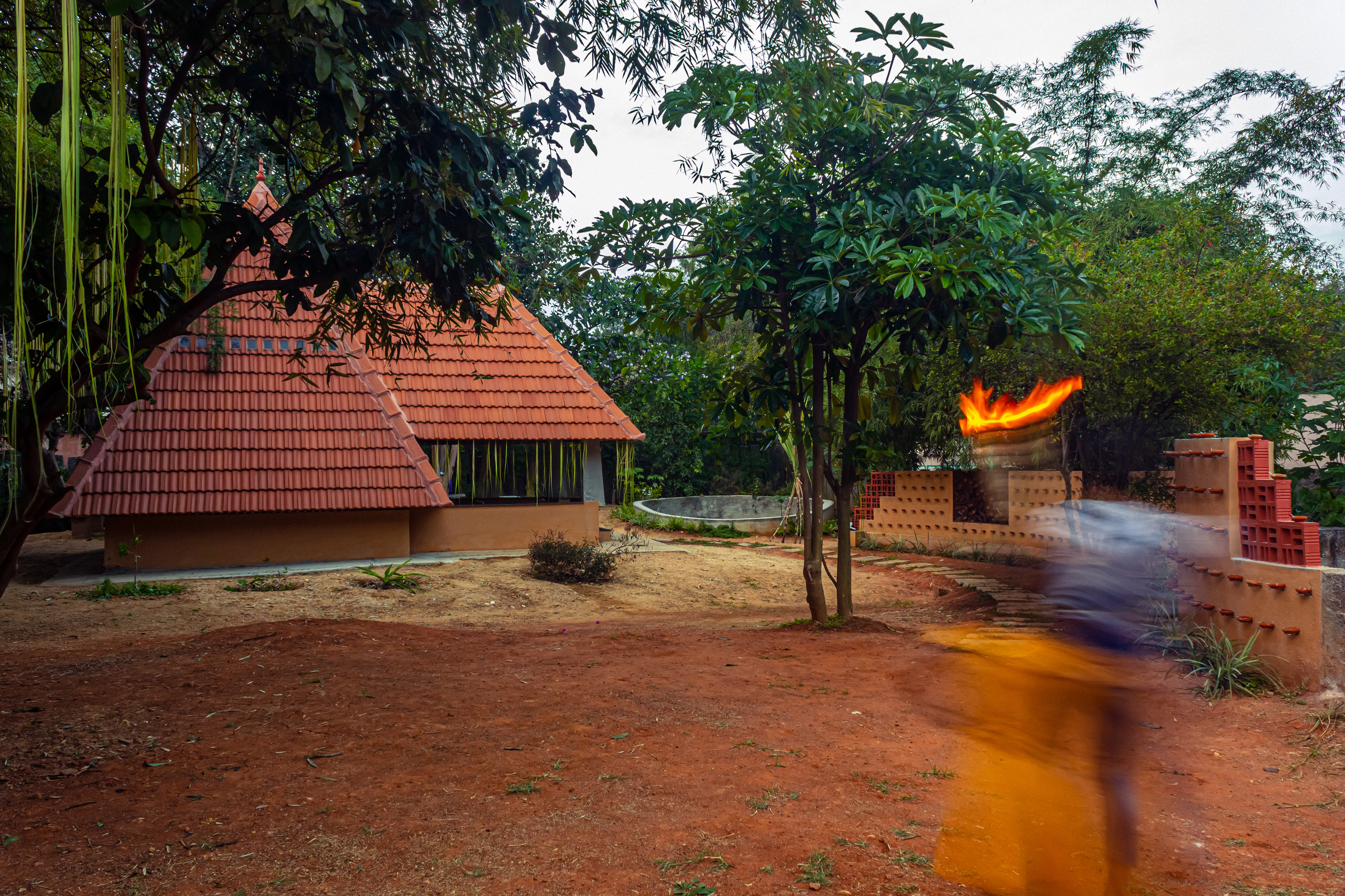 The architectural space at Bodhivana is an intimate small space, a pyramidal structure from four feet below the earth pointing to the sky. It connects earth and sky like a tree. The space invites you to sit, to sit in the company co-seekers, to heal ourselves and the suffering Earth. To regenerate the earth and us within the meaning and glory of mutual fecundity.