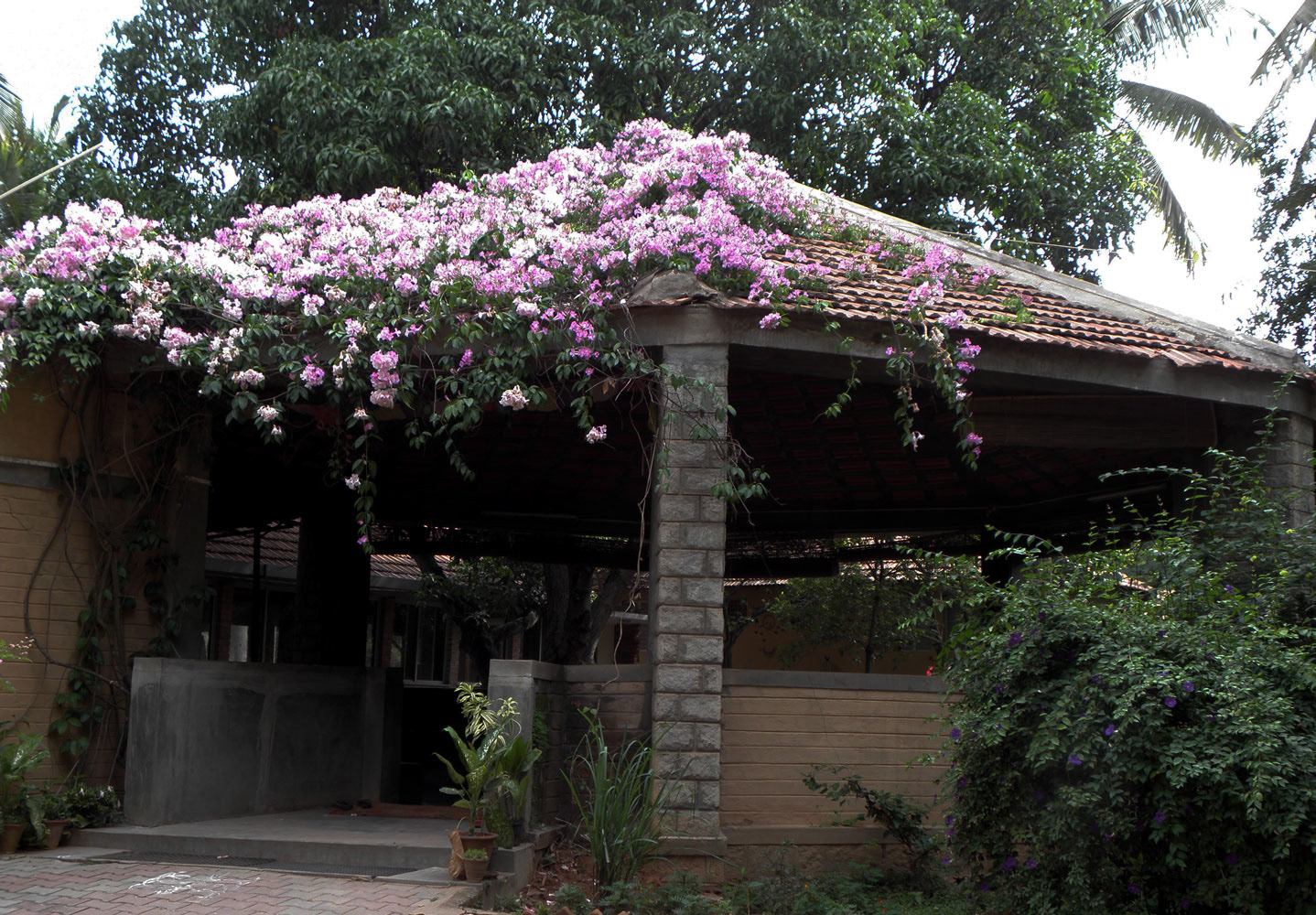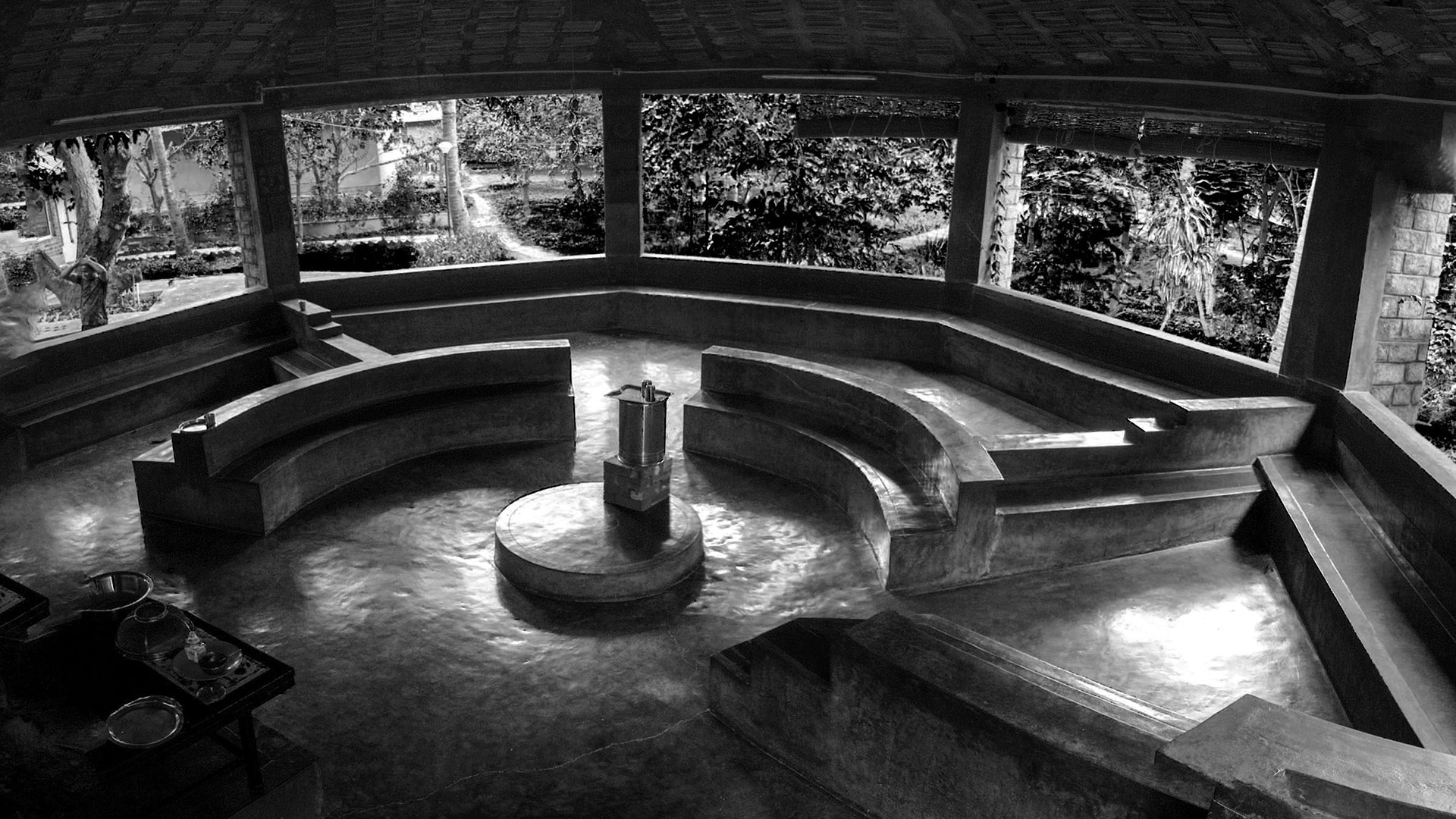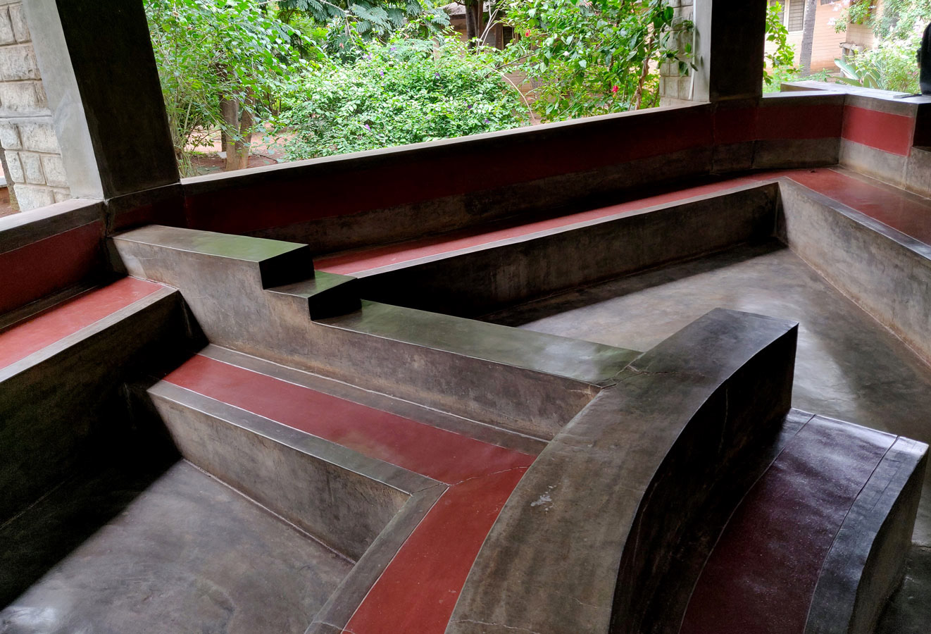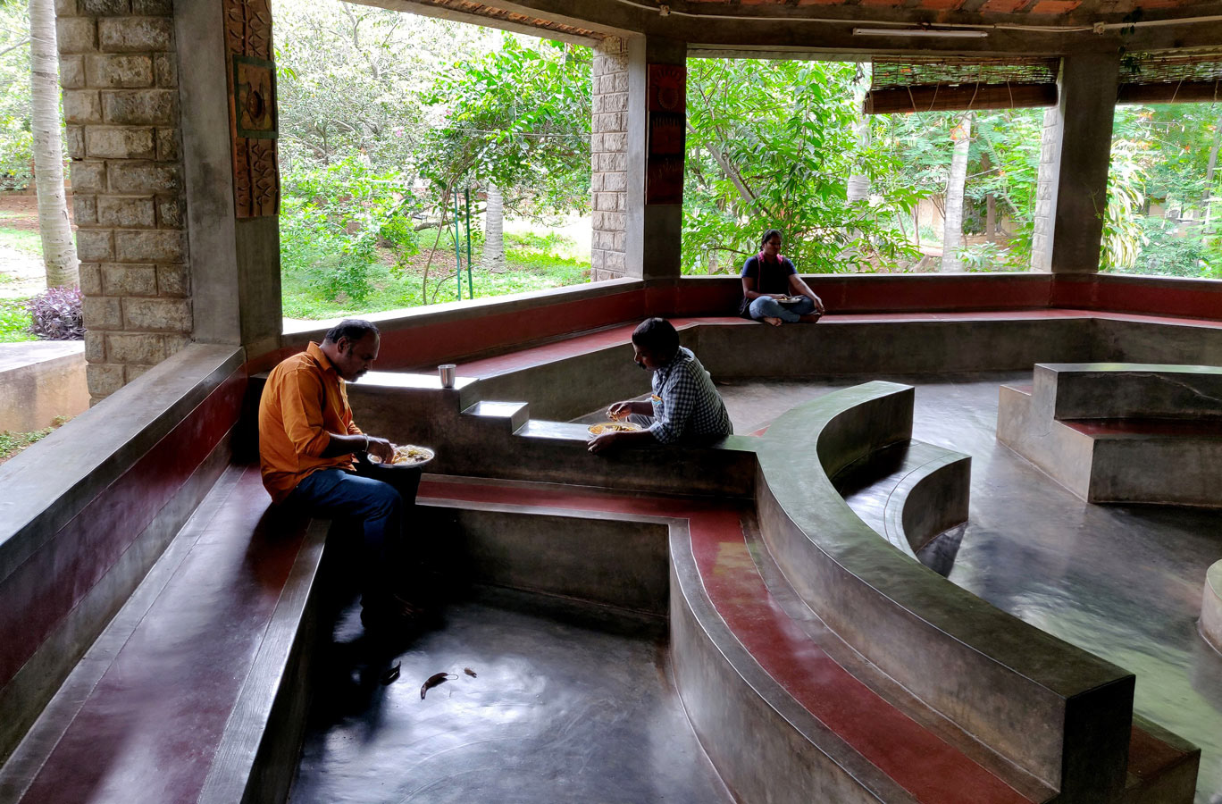The floor of the dining space is in the form of concave with seating arranged at different heights. This again creates a theatrical feel, and can be used also for small intimate performances. The entire space is finished with grey cement, giving a neutral aesthetic appeal in terms of colour. In terms of temperature, the coolest spot in the campus. Even in hot summer, the place holds a pleasant temperature. In our culture people tend to talk considerably while they eat. The way the space is organised, helps, even when about 60 people talk, it never comes loud.