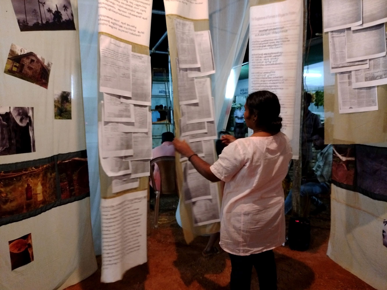 The Maze and Fence of Human – Animal conflict presented the concerns through text, images and sound. A sound installation of about fourteen minutes expressed the concerns over a lopsided forest management policy that simultaneously affects human, farm lands, animals and forest, and also presented the solutions that people of the area suggested. These concerns were supported by documents received from state institutions through RTI(they look liked confessional documents on the grave losses farmers continue to face), other data from people, handwritten appeals from the residents, and sound and images. It was also a space for visitors to express their voices in written form on pieces of colour cloths; to be stitched together to make a quilt.