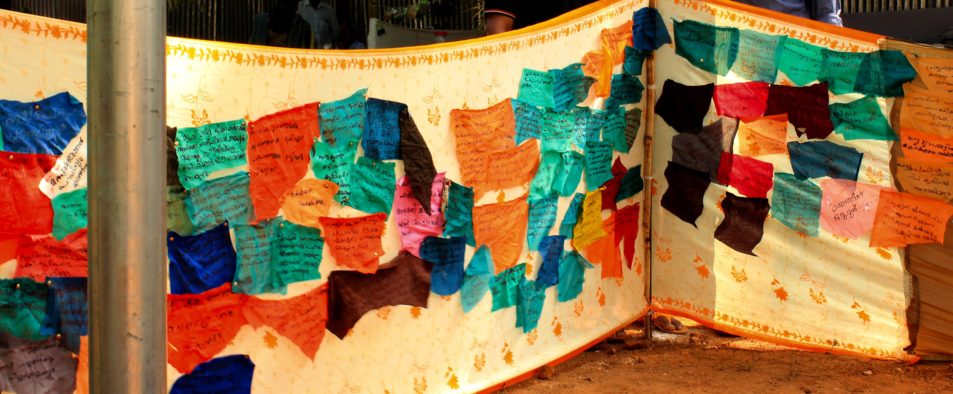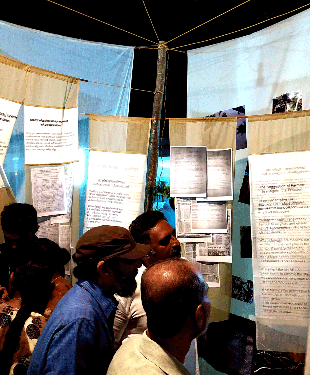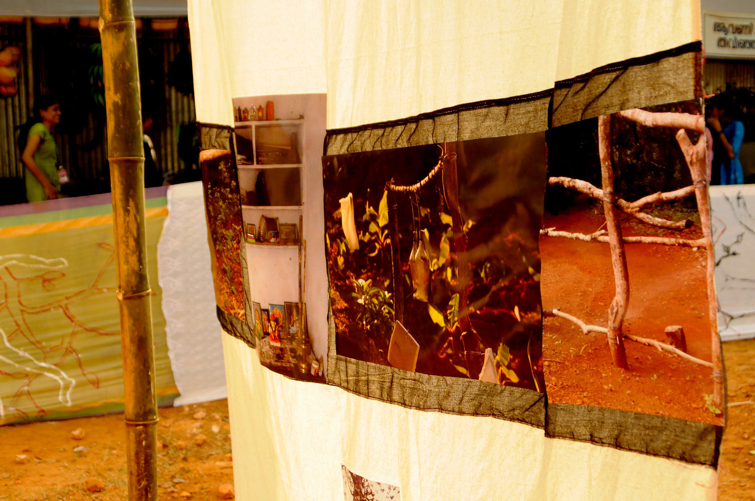 A 90-foot-long fence made of old sarees, the same way farmers spread cloth around their land to protect their crops from wild boar. A panoramic view of a landscape depicting the relation between humans, farm land, wildlife and forest was drawn on the sarees. And on the inner side of the same sarees, the visitors wrote their responses to human-wildlife issues to form a quilt of responses.