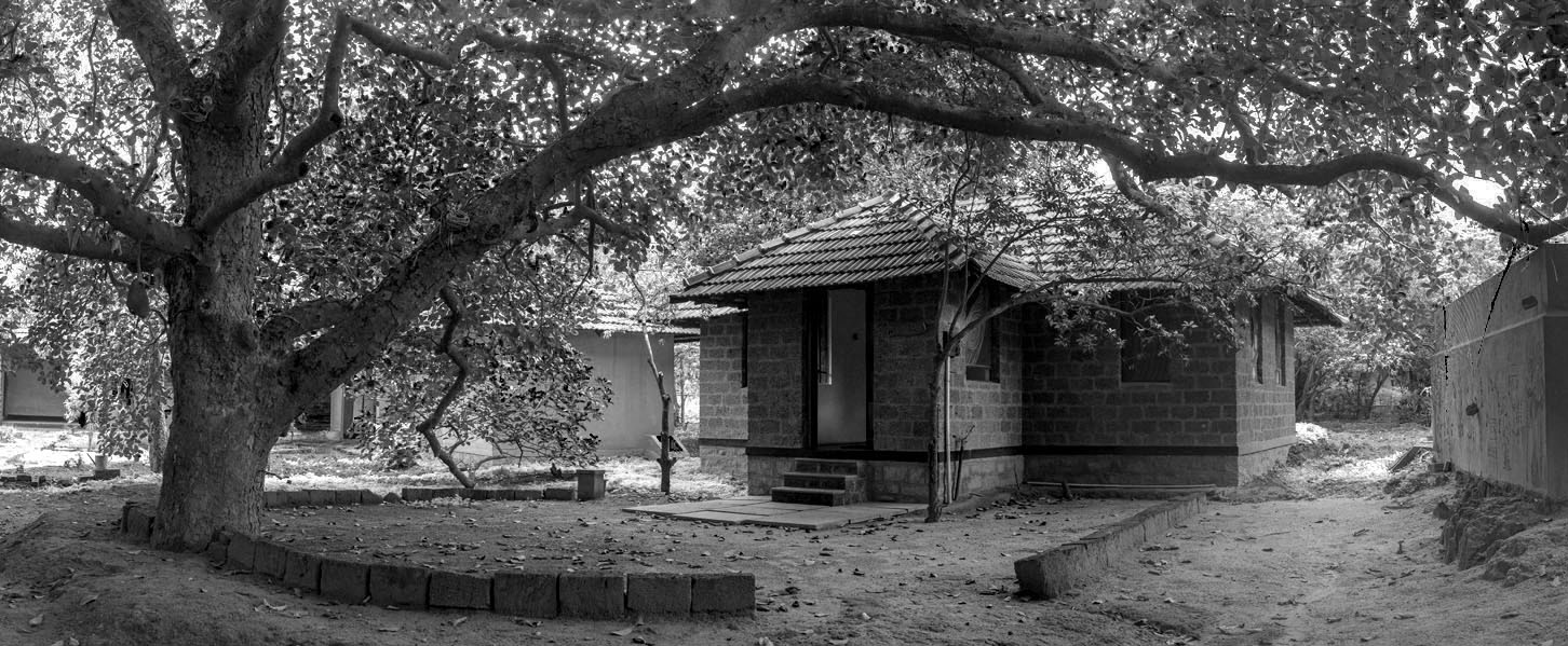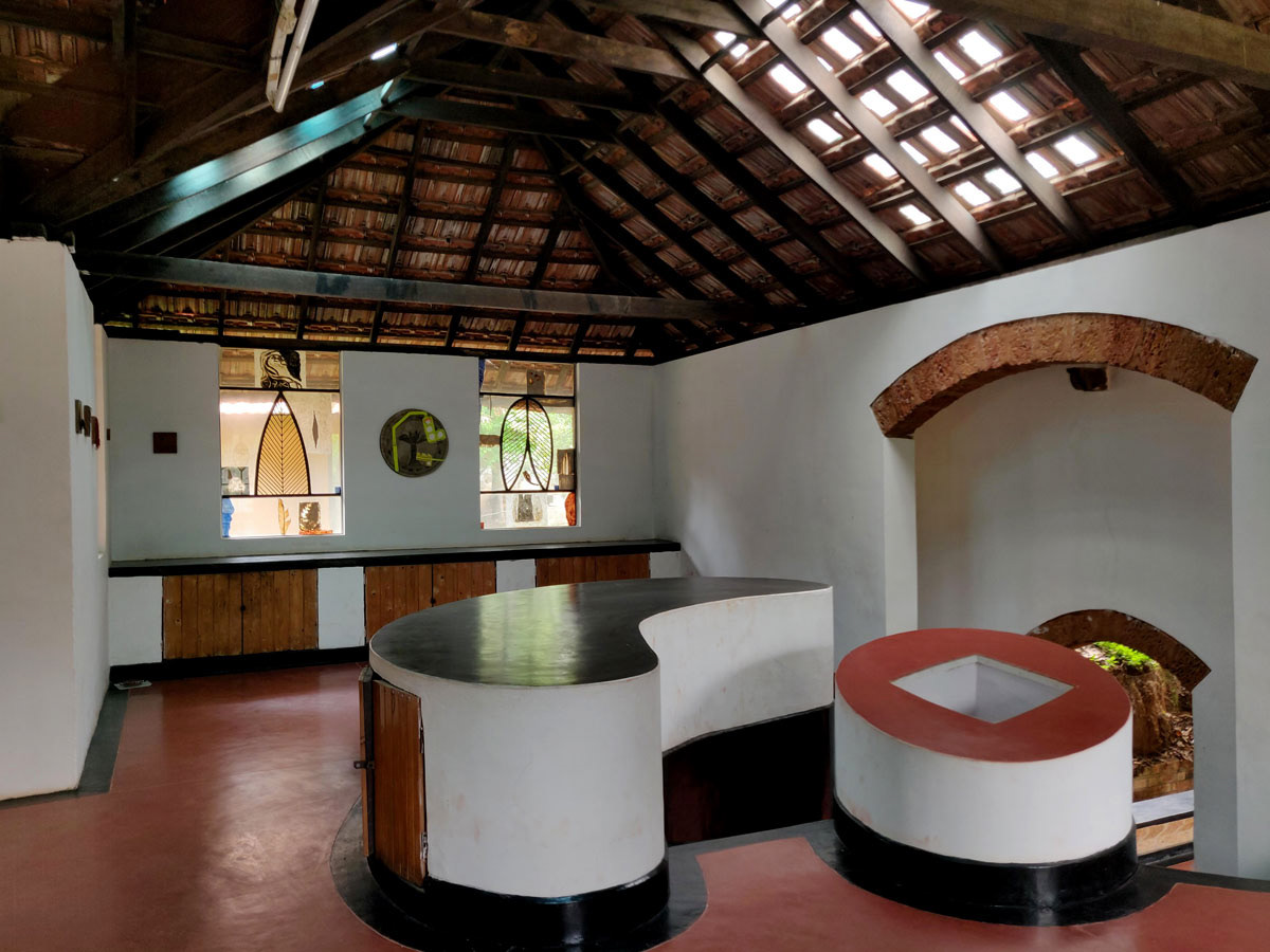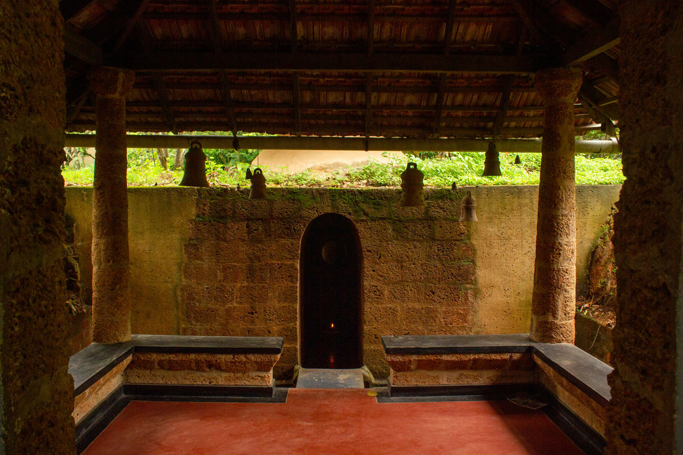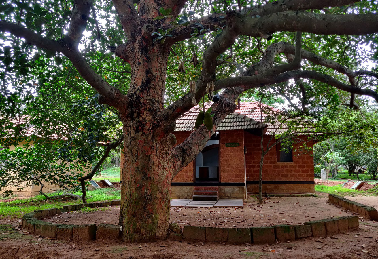 Made from laterite blocks brought from Kannur and by traditional skilled masons from Kerala, the colour of the building matches the orange flesh of the jackfruit tree. One is drawn to its un-'awe inspiring' proportions with a sense of interiority and introspection. The front door when closed reveals a burnt surface with an impression of a large pipal tree leaf. The door, one realizes later, is made irrelevant by the fact that the space is open from the other side.