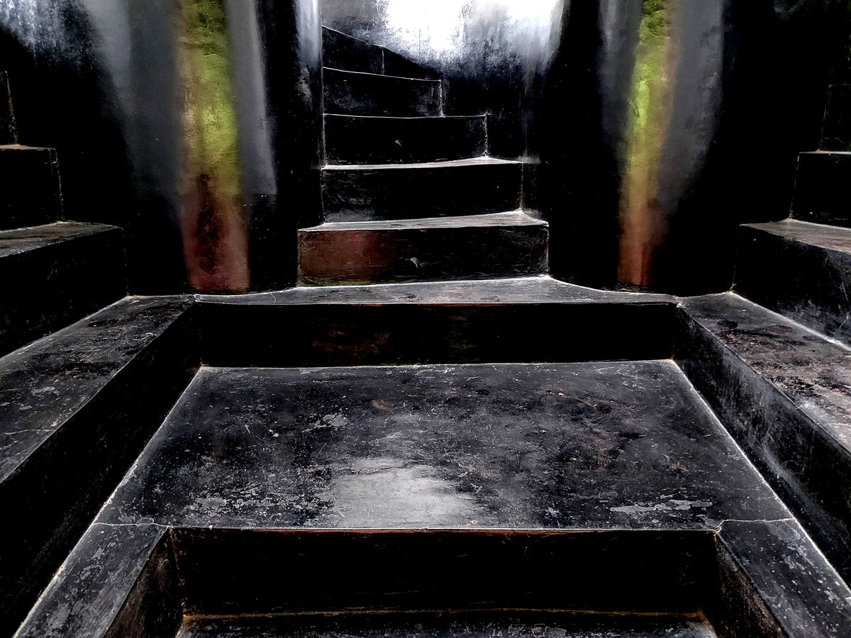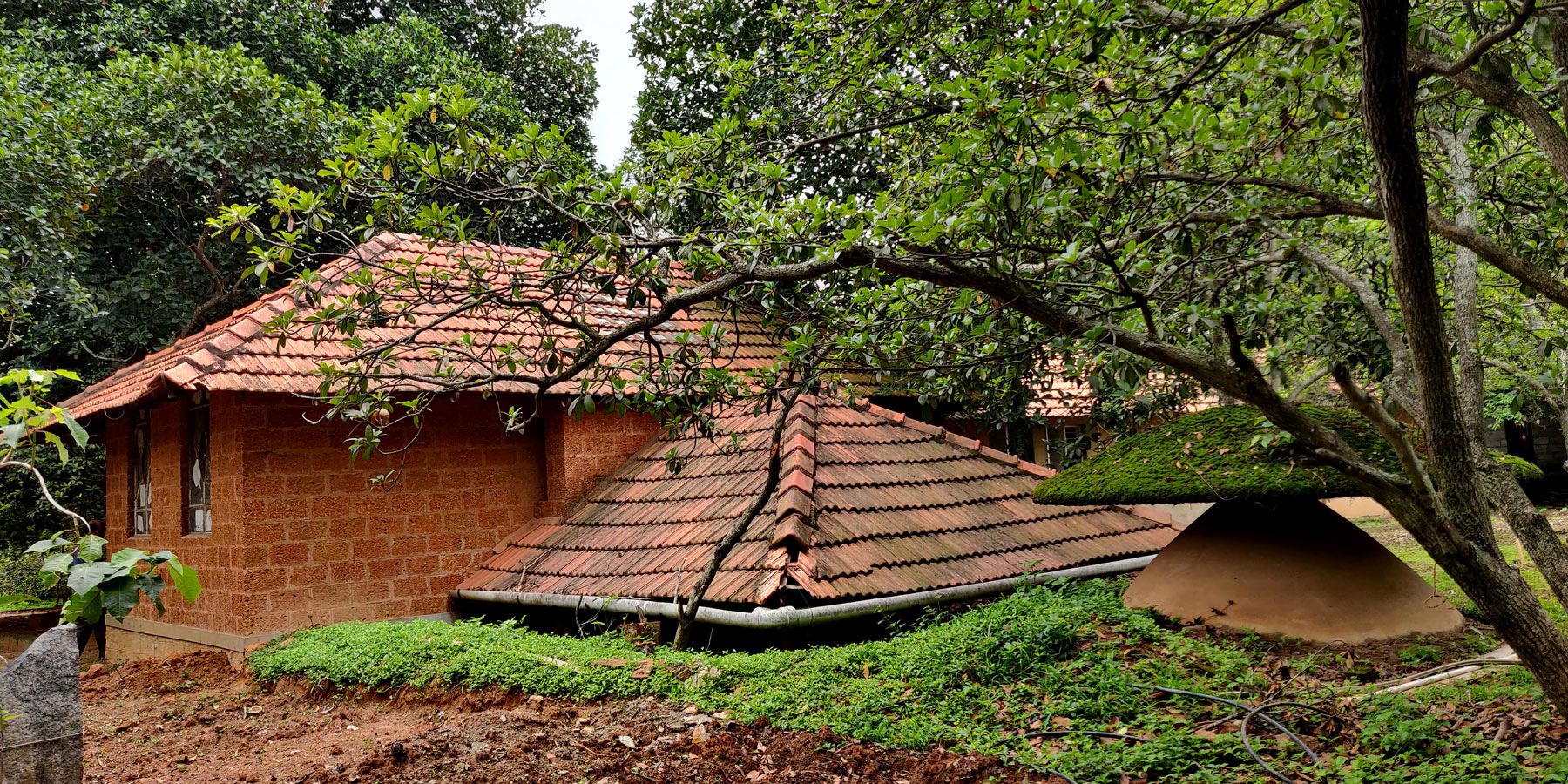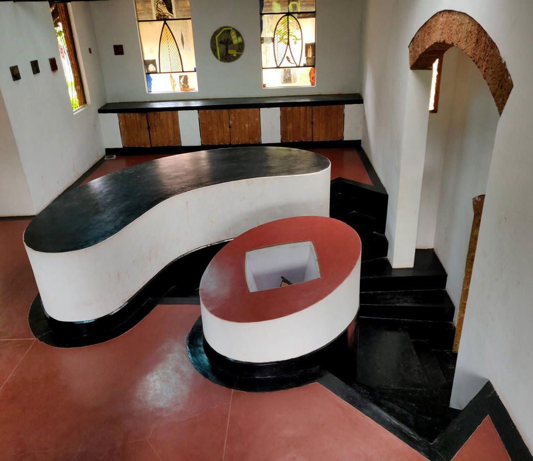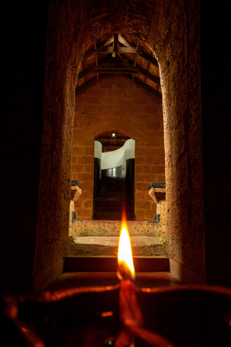 Made from laterite blocks brought from Kannur and by traditional skilled masons from Kerala, the colour of the building matches the orange flesh of the jackfruit tree. One is drawn to its un-'awe inspiring' proportions with a sense of interiority and introspection. The front door when closed reveals a burnt surface with an impression of a large pipal tree leaf. The door, one realizes later, is made irrelevant by the fact that the space is open from the other side.
