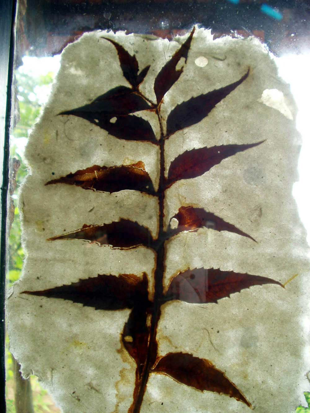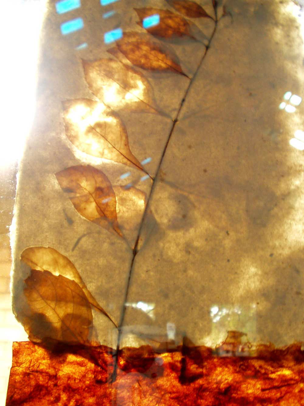 The other four windows in the main space face each other and constitute works by C F John and Raghavendra Rao. Apart from lithograph prints, these again have natural matter embedded on recycled paper pulp on the glass - things that would otherwise constitute waste - a film peeled from the stem of a banana trunk, decaying leaves, coverings of bean pods... Placed this way with light streaming in through them and revealing hidden patterns, these objects call out to you and, to use a phrase by Jaques Barzun, 'stir the senses to seeing'. One is not expected to look for the universe or eternity in them, or to be led into abstractions, and attach extraordinary meanings to them. They have been placed to just be seen for what they are, and their existence acknowledged and if possible celebrated.