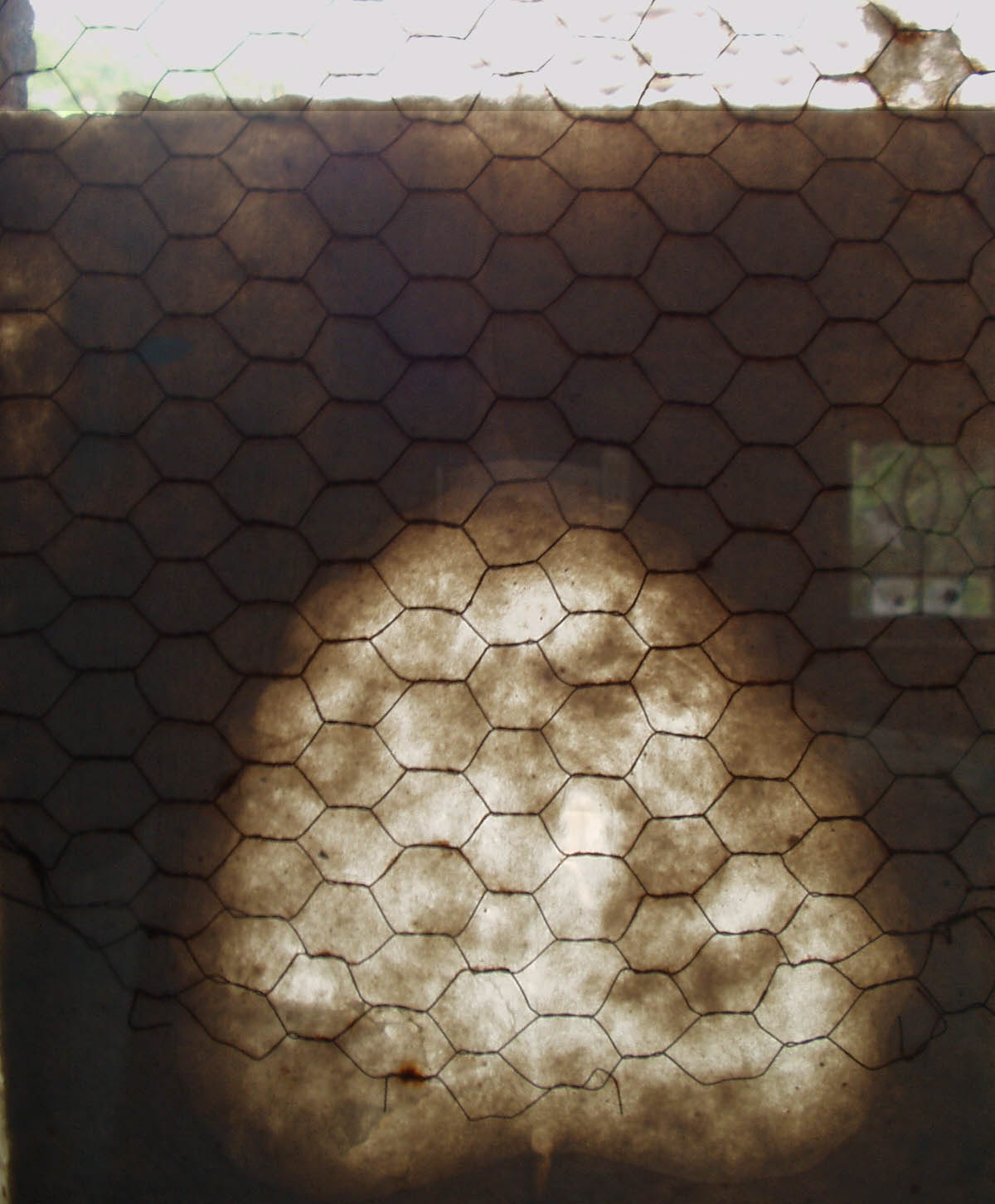 Apart from from Jeet Ipe, who gave structural advice for the building, many artists, craftspeople and workers have contributed to the making of Mandala. As you enter you are welcomed by two medium-sized windows facing each other with strips of recycled paper laminated between glass windowpanes. Done by Jenny Pinto, the one on the right is an enlarged fingerprint and the other has patches of strips weaved together and placed alongside pieces of coconut fibres that show a natural version of the same pattern. From these ordered works one is introduced to frames where the play of order and disorder is much more vigorous. Apart from the works placed on the windowpanes, you could adjust your gaze to focus on the trees and the growth outside, or on reflections of glass tiles of the roof.
