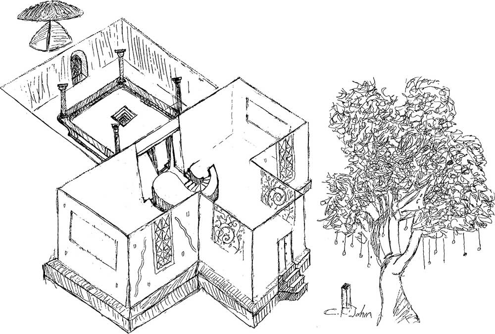 On the western periphery of this tree, built in line with its stem and the sun's trajectory, is a small cottage with red tiled roof. In between is a brick-lined semicircular space in the middle of which we see an earthen pot placed in the earth. The tree, pot and the building (and the sun) together complete the Mandala.