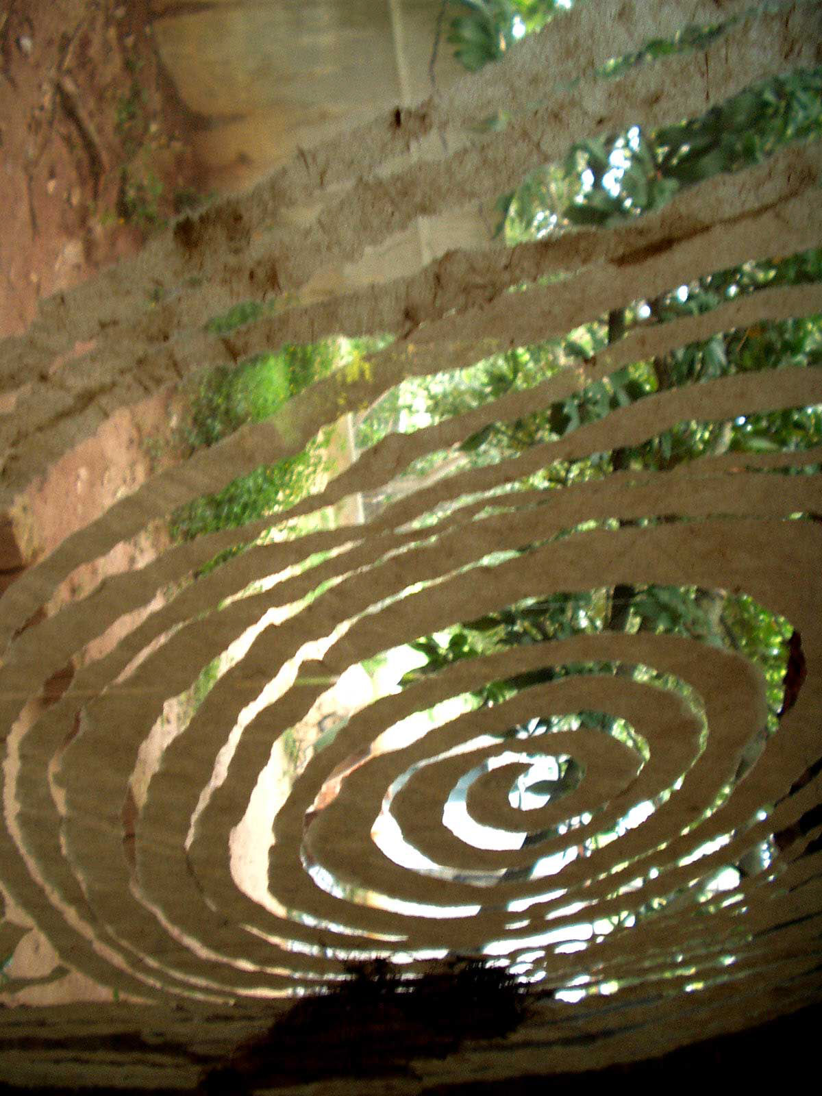 First I wanted to do it inside the well, a structure coming out of it. It was for financial reasons I started looking to connect it with the jackfruit tree, but it happened for the good. So the mandala in a way is also making the visitor to enter the well in a different light. In another light it is also like entering the root of a tree and reaching its canopy, its blossom. For the innermost space I appropriated the form of 'kudakallu' from Chermanangad near our village, vellattanjur. Architecturally it has an interesting form. It is like the canopy of the tree structure from a grove or the blossoming of any form, primal in nature. I would like to thank Jeet Ipe and his team for the structural advice.