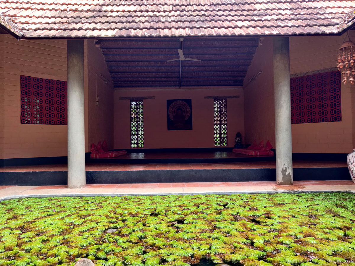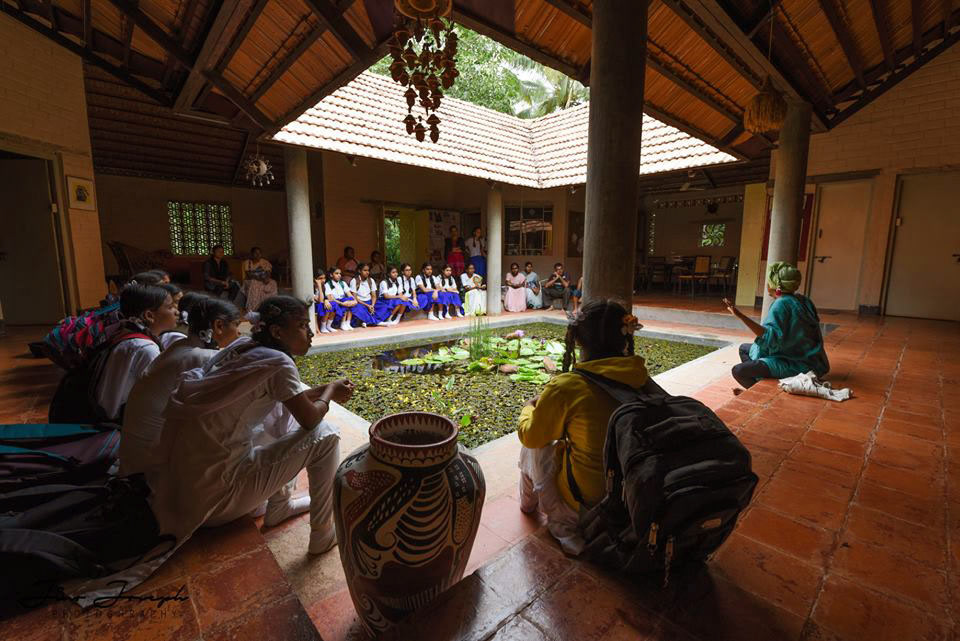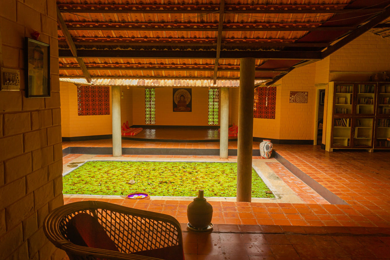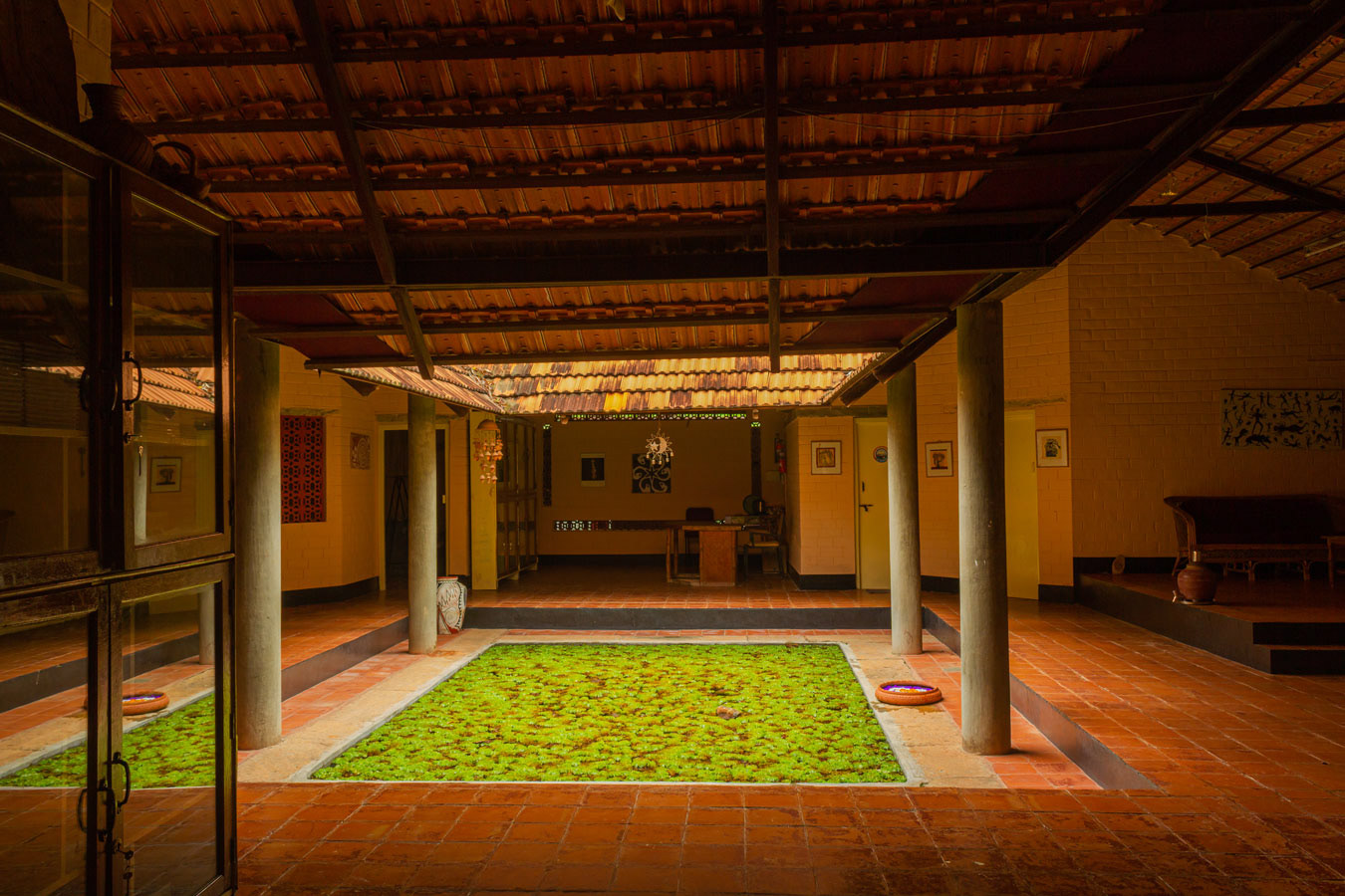 I felt the architectural space has to be more than a functional space. For the office space I made an attempt to provide an experience of the expanse of the land outside even when a person enters inside. It was a process of enveloping a space within a larger space by organising and moulding by solid elements of mass, making the architecture come into being. The interaction between the forms and space is made possible at different scales. At each level, I feel we should be concerned not only with the form of a building but also its impact on the space around it. No form would stop at the edges of it, it in fluid ways extend to the space around. As you move around this space, you will experience these meanings without your own knowing. As you enter you see only an open space with different levels of floor, almost theatrical, with a central water body open to the sky, sun coming in, blooming water lilies and weeds, also bringing smiles on the visitors. The walls on both sides are cut and joined with terracotta jali and hand moulded grill using the rangoli design of sprouting seeds. The floor is laid with very basic terracotta tiles, a functional taste which we can not find today. The rooms are hidden in four corners of the space, giving sufficient privacy to the staff on their work. The space invites a feel to gather and holds a sense of community spirit. It makes you calm, helps constructive thinking and work.