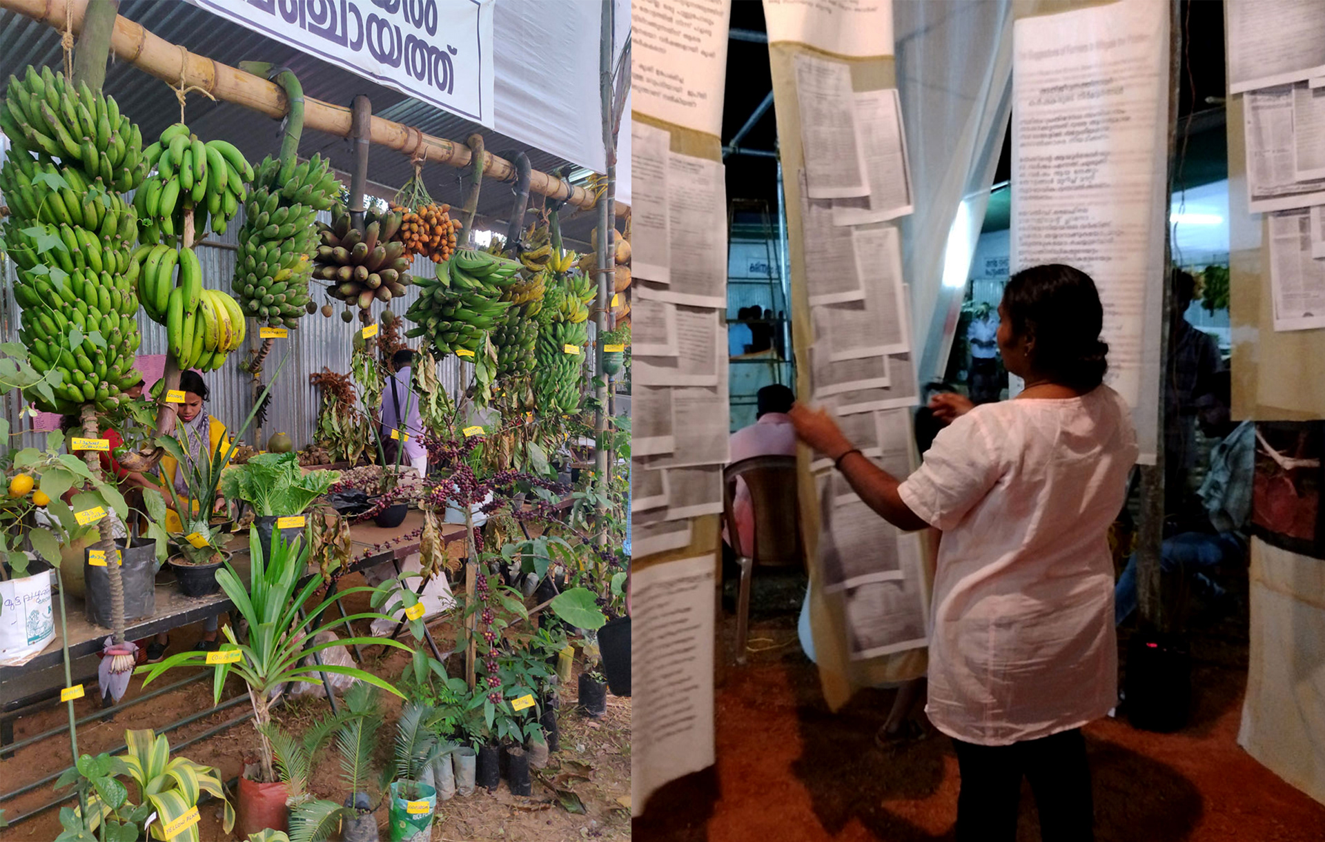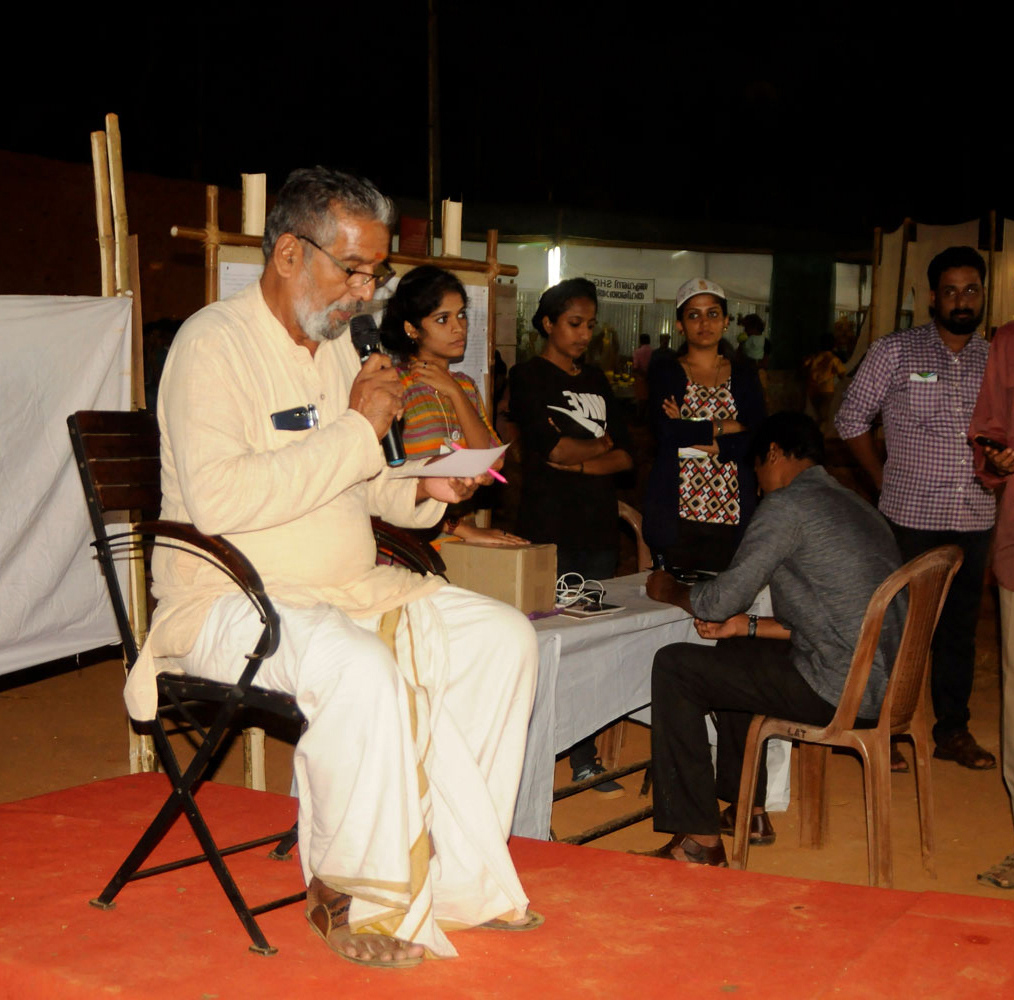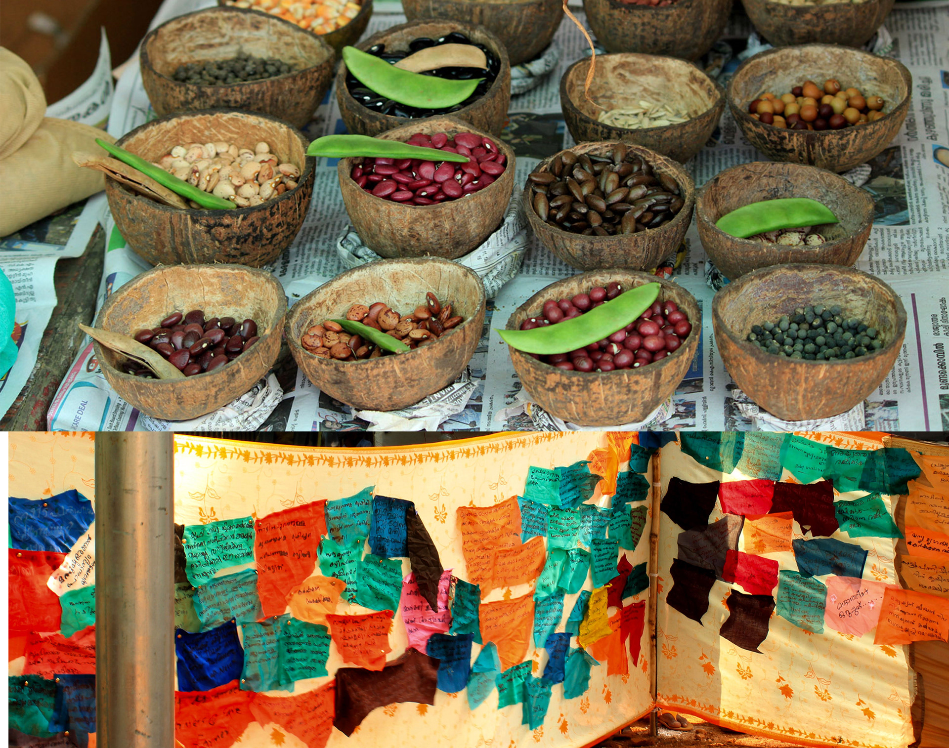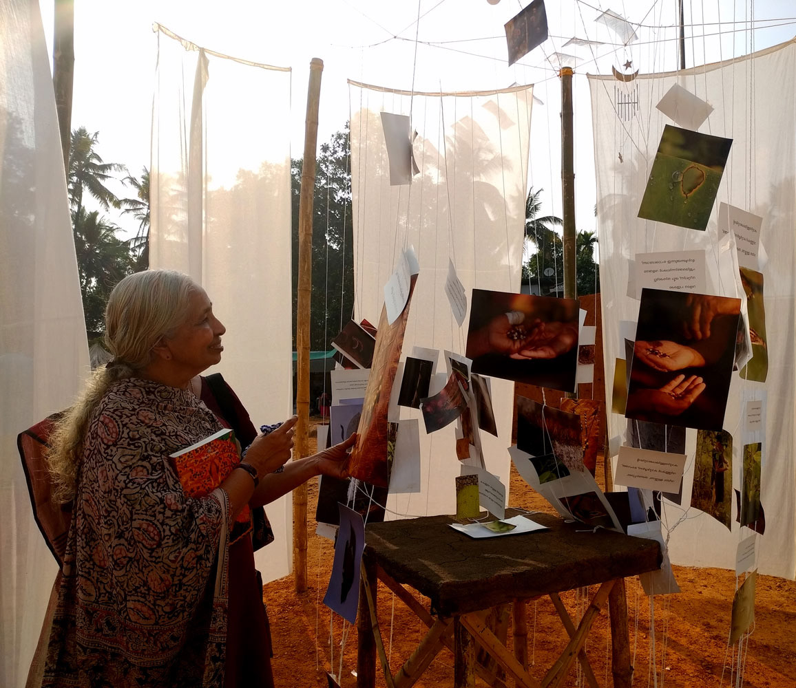 Sunil P Unni who was helping us with the installations spoke on behalf of many, saying, “These installations demolished the understood notions of installation art and the expectations. They are serving as translations. Because these spaces clearly translated the inner workings of the act of farming and seeds. These installations spoke to each one’s right to her own context of life. For a farmer, it inspired her to re-enter and see herself again; for a student it was like a burning coal striking within her, making her recognise that it was her duty to be part of this and to nurture. For a salaried person, he would have wondered why until this day he hadn’t been able to look into the eyes of a farmer, why until now he could not serve as a helping hand to the farmer. These installations taught people, when they walked around seeing the innumerable seeds, also to look at the farmer’s face and see the scars it bears. That is how these forms have made themselves rich. At a time when we’ve got used to seeing art forms that are mystified or remained as spectacle to look at, these are without veils and directly connects to life. It is like it is said in the Bible, they spoke different languages but each one understood it in their own language. Here, people came from different backgrounds but understood from their own level, that is the success of these presentations.” He added, “These installations also hid themselves from some others.”