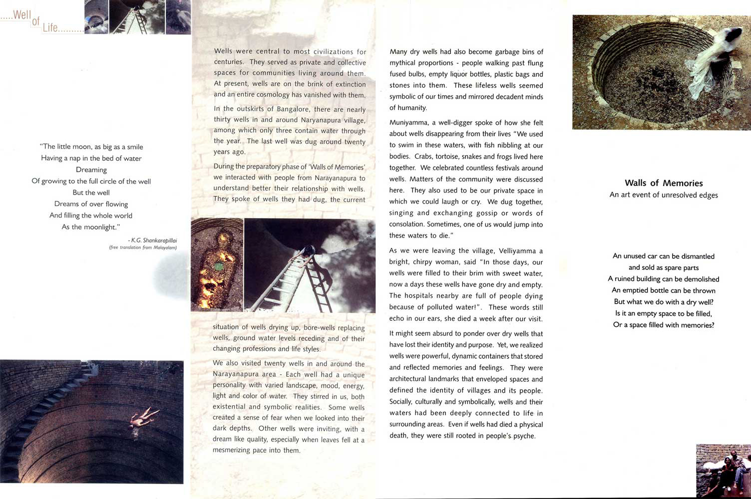 During the preparatory phase of the art project 'Walls of Memories', three of us, C.F. John, Tripura Kashyap and Azis T.M interacted with the community of Narayanpura to understand better their relationship with wells. They spoke of wells they had dug, wells drying up, bore-wells replacing wells, ground water levels receding, and of the changing professions and lifestyles. One day as we were leaving the village, Velliyamma a bright, chirpy woman, came up to us and said "In those days, our wells were filled to their brim with sweet water, now a days these wells have gone dry and empty. The hospitals nearby are full of people dying because of polluted water!" These words still echo in our ears - she died a week after this meet.